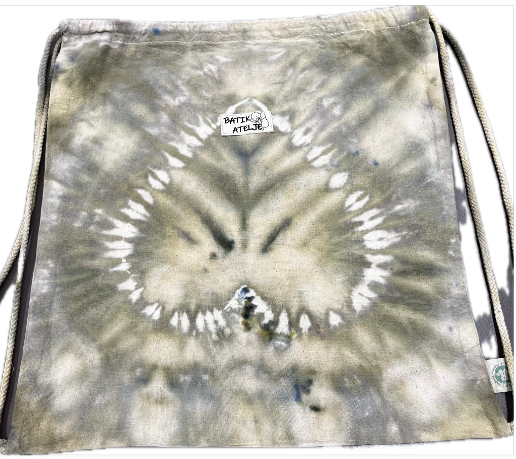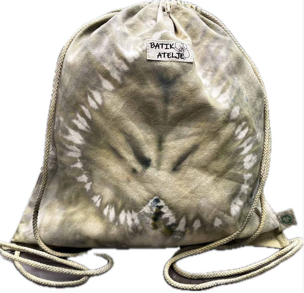 Monipuolinen puuvillainen kiristysnyörillinen reppu.