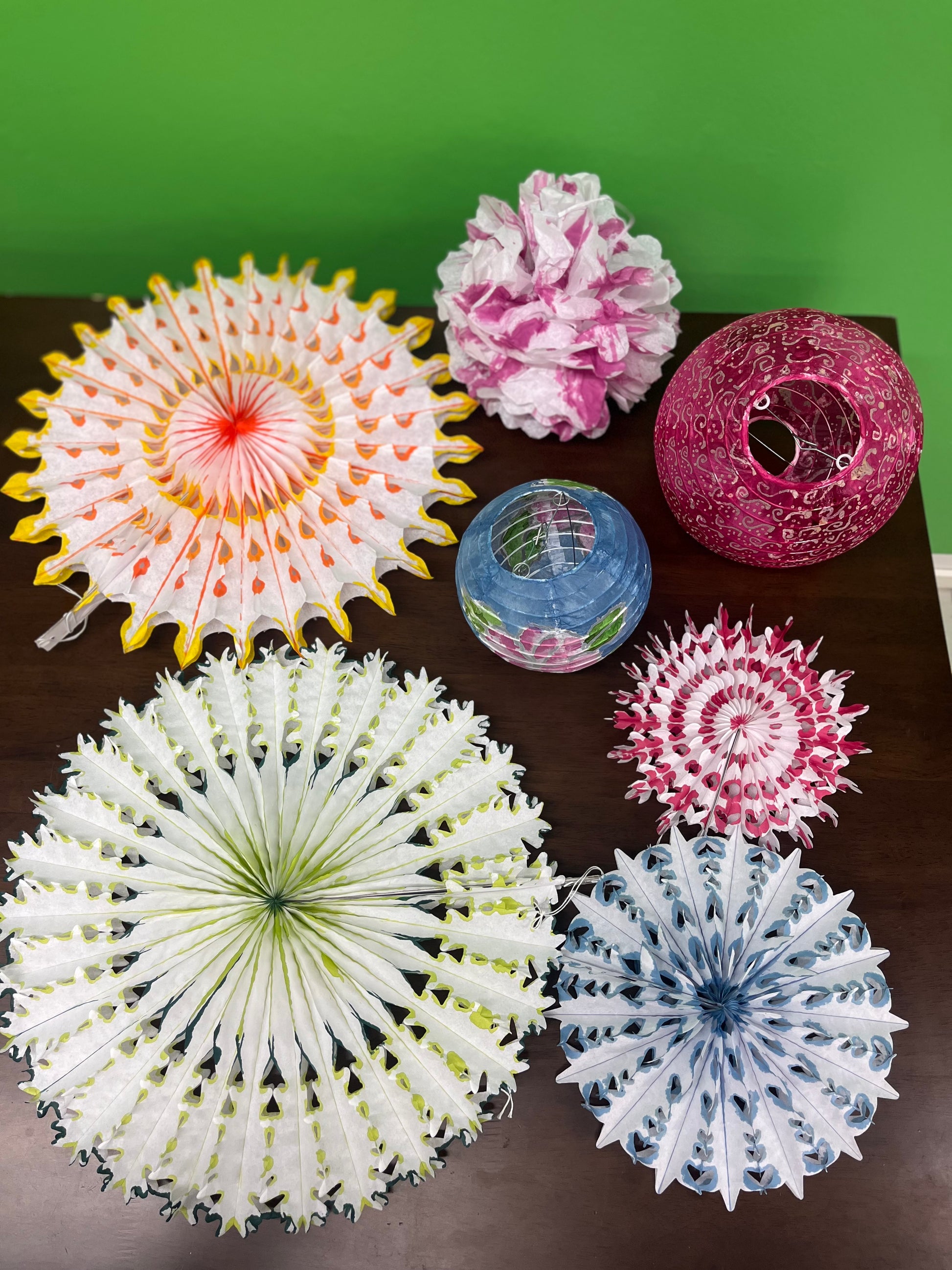 Taidepajassa pääset koristamaan paperipalloja, paperipompomeja ja lumihiutaleita.